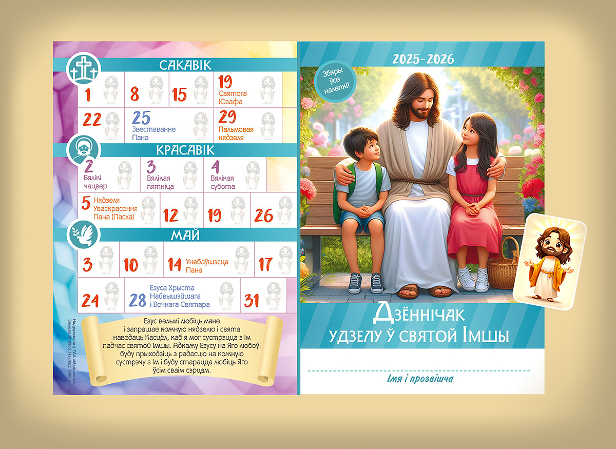 Для хрысціяніна, які любіць Бога, удзел у Святой Імшы – гэта радасць, а не сумны абавязак. Бо менавіта тут адбываецца найглыбейшая сустрэча чалавека з Богам. Палюбіць штонядзельную Эўхарыстыю і навучыцца гэтай дысцыпліне з дзяцінства дапаможа наш каляндар-дзённік з налепкамі на 2025-2026 навучальны год. У ім адзначаныя ўсе нядзелі і абавязковыя святы, што дапамагае не забыць, у які менавіта дзень трэба прысутнічаць у касцёле. А набор налепак дапаможа дзецям у форме гульні прывучыцца да гэтай дысцыпліны любові.